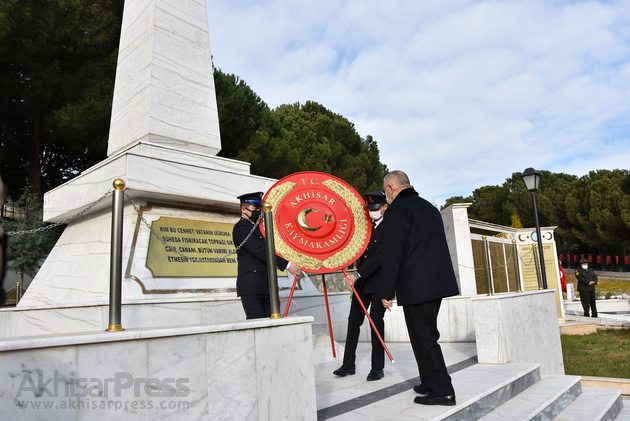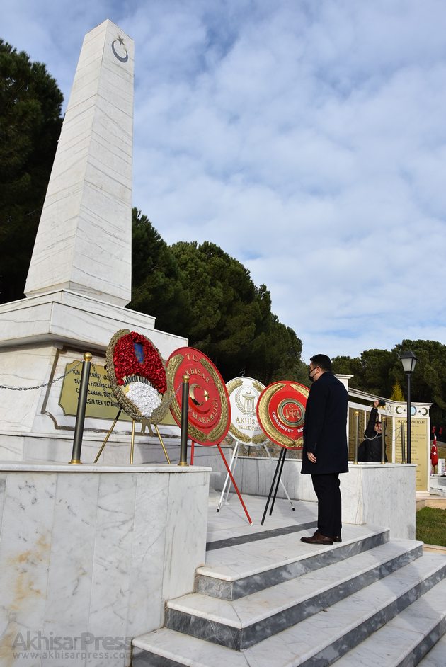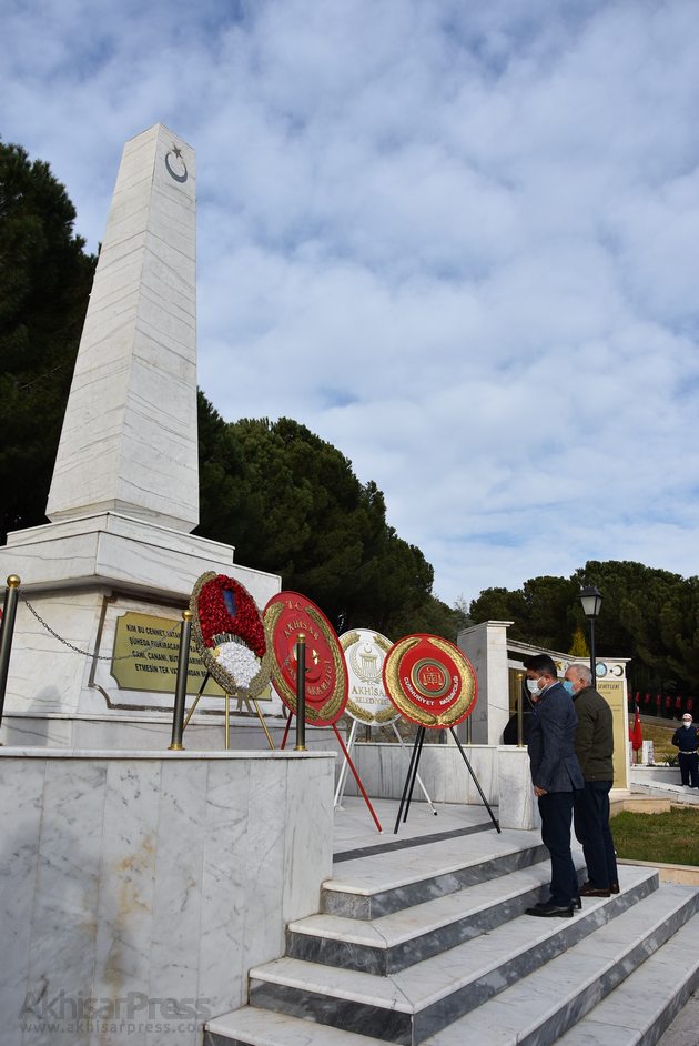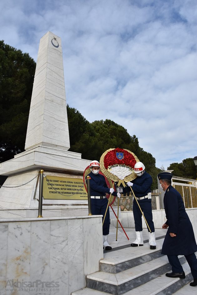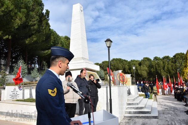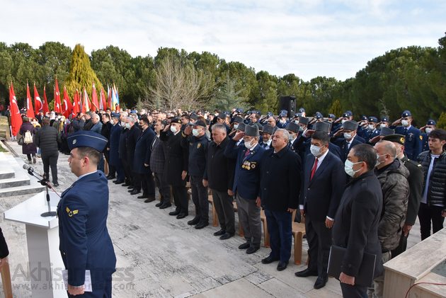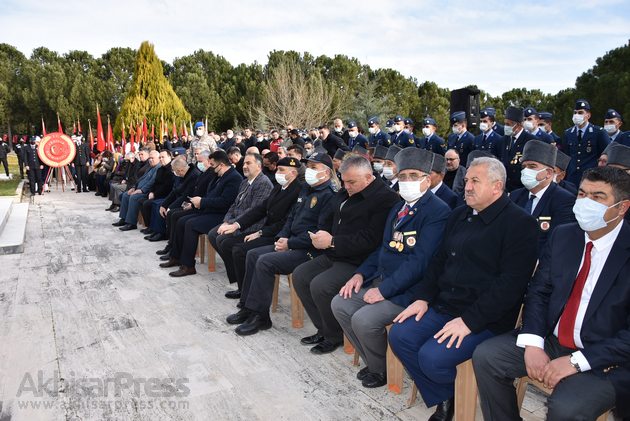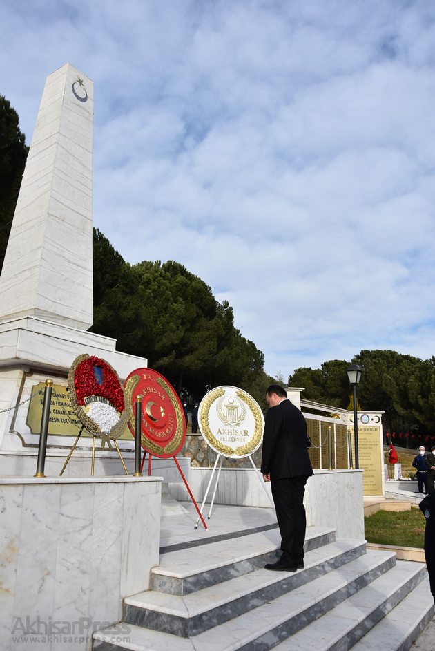 Hava Trafik Kıdemli Üstçavuş Örpen Gönül'ün sunuculuğunu yaptığı program Saygı duruşu, Saygı atışı ve İstiklal Marşının okunmasıyla çelenk koyma töreni başladı. Şehitlik anıtına sırasıyla Kaymakam Sabit Kaya, Hava Meydan ve Garnizon Komutanı Hava İstihkam Albay Mehmet Şahin, Akhisar Belediye Başkanı Besim Dutlulu, Cumhuriyet Başsavcısı Tunay Pulçe, Türkiye Harp Malulü Gaziler, Şehit Dul ve Yetimleri Derneği Başkanı Cehalettin Çabuk çelenk koydu. Günün anlam ve önemini belirten konuşmayı Hava Trafik Kıdemli Üstçavuş Örpen Gönül yaptı. Üstçavuş Örpen Gönül;" Bugün, bağımsızlığımızın timsali, milletimizin vatanı uğruna sergilediği. Fedakarlığın ve kahramanlığın bir ‘destanı olan Çanakkale zaferi’nin 107’inci yıl dönümünün gururunu ve aziz şehitlerimize karşı olan vefa görevimizi yerine getirmenin onurunu bir kez daha yaşıyoruz. Ayrıca bugün, siperler arasındaki mesafenin sadece birkaç metre ve ölümün kaçınılmaz olduğu bir muharebede, öleni görüp kısa bir süre sonra kendisinin de öleceğini bildiği halde! En ufak bir duraksama göstermeden,. Yılmadan savaşarak, milletimizin yüzyıllardır sarsılmış özgüven duygusunu yeniden kuvvetlendiren Çanakkale ruhunun oluştuğu gündür.