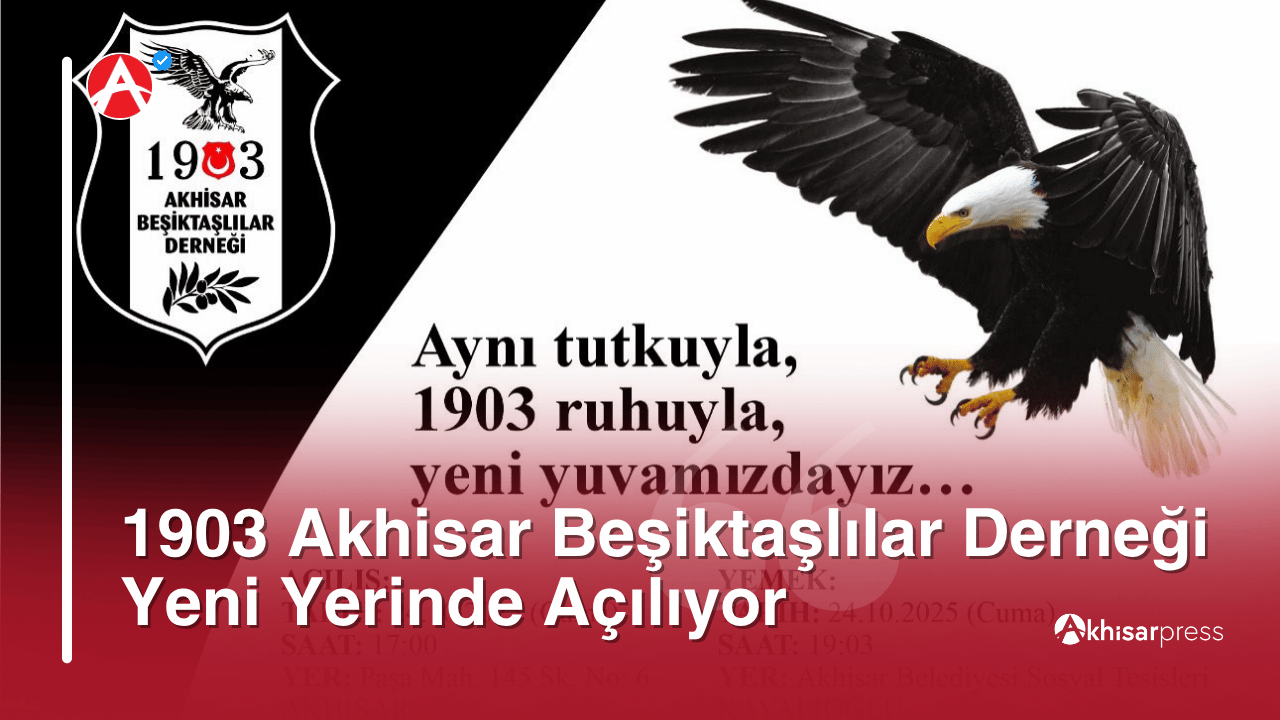 1903 Akhisar Beşiktaşlılar Derneği, yeni hizmet binasının açılışını 24 Ekim Cuma günü gerçekleştirecek. Dernek Başkanı Dr. Uğur Halaza, yaptığı açıklamada Beşiktaş sevdalılarını bu özel güne davet etti.