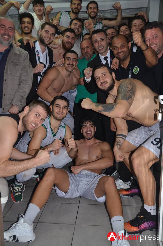 Taraftarları parkede sevinen basketbolcular soyunma odasında kulüp başkanı Ali Merde ile galibiyeti kutladılar.