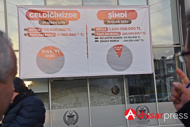 Tasarruf tedbirleri ve yatırımları ile hem hizmet yaptıklarını hem de borç ödediklerini ifade eden Başkan Dutlulu, konuşmasında şu ifadelere yer verdi; “Şeffaf Belediyecilik anlayışımız ile Akhisar Belediyemizin 2019-2024 yılları karşılaştırmalı bütçe ve borç bilgilerini halkımızı bilgilendirmek için belediye binamıza astık. Borcun bütçeye oranı 2019 yılında yüzde 44 iken, bu oranı 2024 yılında yüzde 16’ya düşürdük.