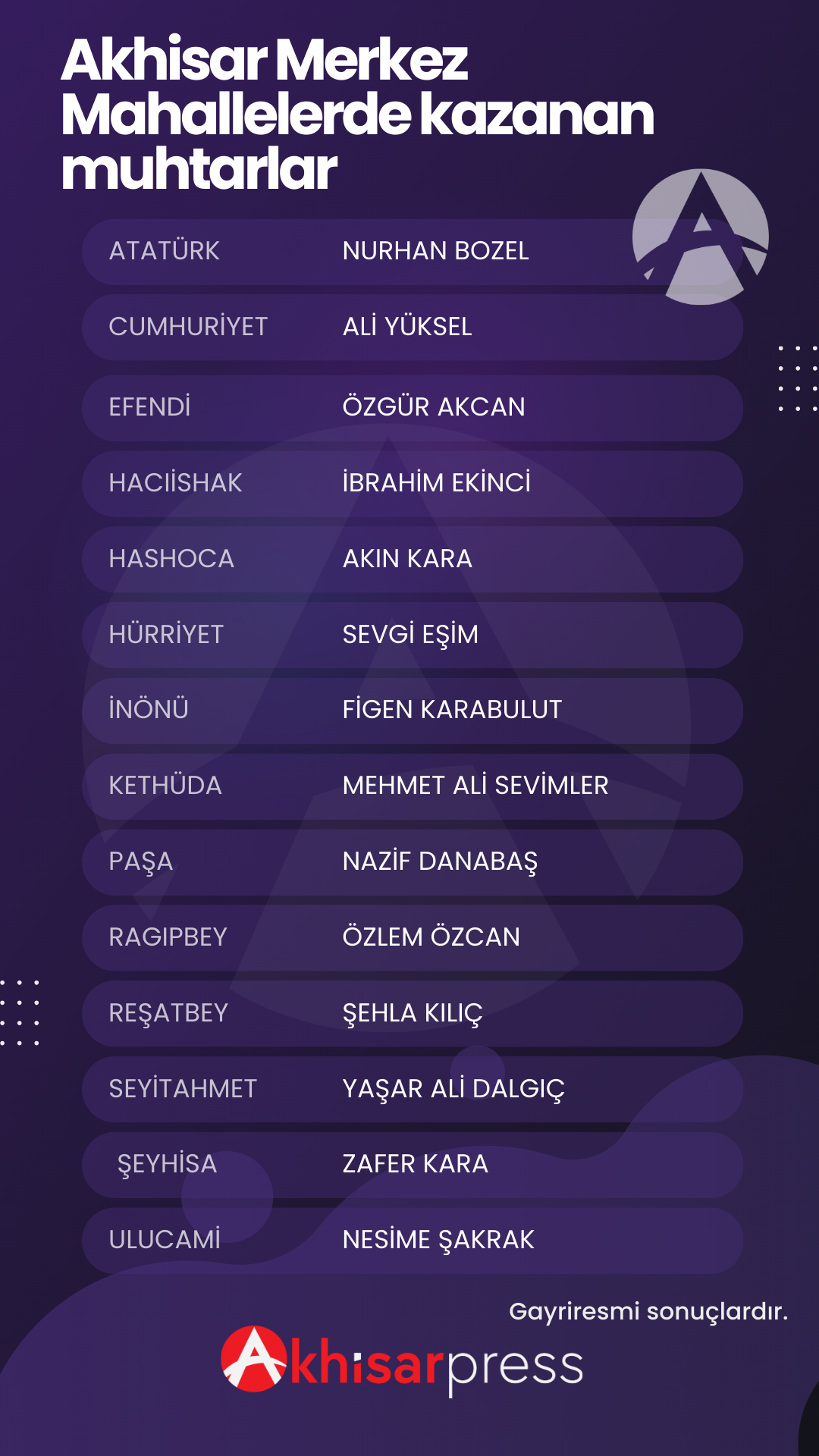 Resmi olmayan sonuçlara göre 31 Mart 2024 Yerel Seçimlerinde Akhisar'ın Merkez Mahallelerinde kazanan muhtar adayları belli oldu.