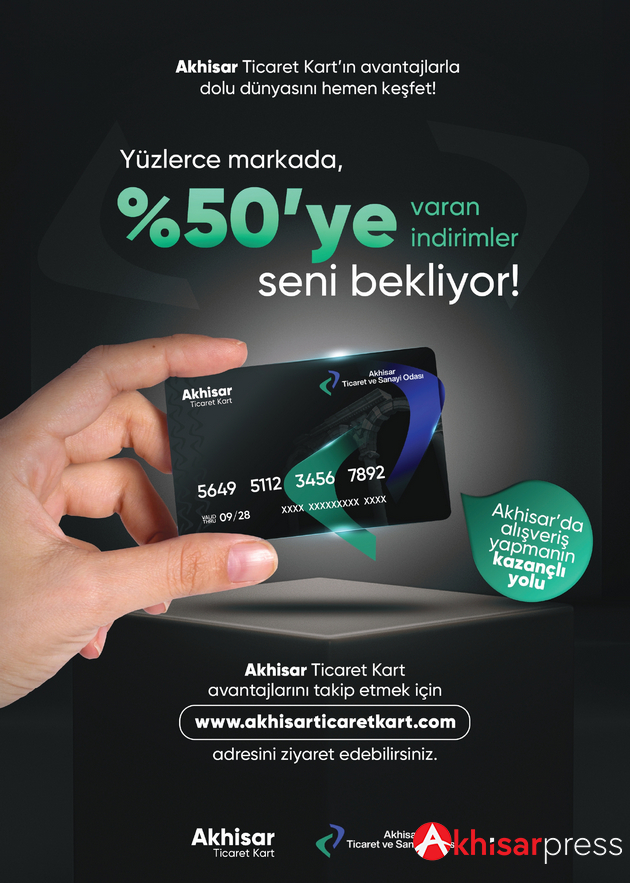 Akhisar Ticaret Kartı, üyelerimize avantajlı alışveriş imkânının yanı sıra, Türkiye genelindeki anlaşmalarımızla konaklama, restoran, seyahat, sağlık gibi ihtiyaç duydukları alanlarda da destek olmayı hedeflemektedir. Kartın avantajları hakkında daha fazla bilgi edinmek için ww.akhisarticaretkart.com adresini ziyaret edebilirsiniz.