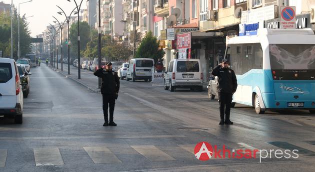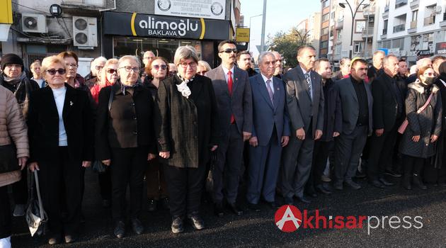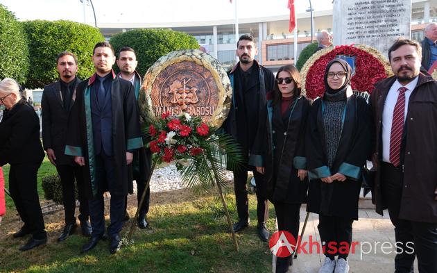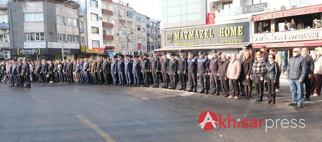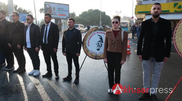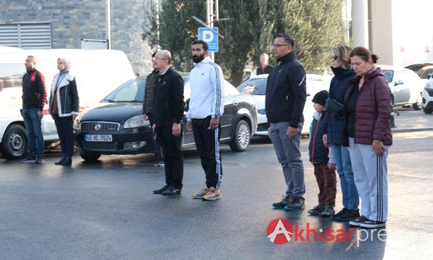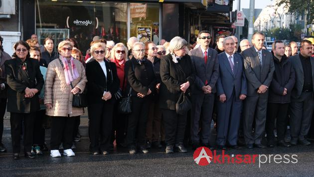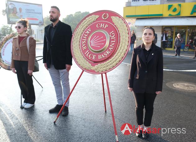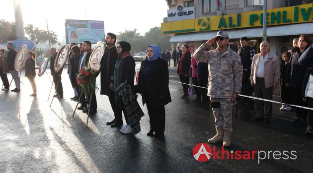 Tören, Atatürk Anıtı'na çelenklerin sunulmasıyla başladı. Akhisar Kaymakamı Kütük, Garnizon Komutanı Borazan ve Belediye Başkanı Dutlulu sırasıyla çelenklerini sunarken, anma etkinliğine katılanlar iki dakikalık saygı duruşunda bulundu. Saygı duruşu sırasında çevredeki vatandaşlar da durarak saygılarını gösterdi.