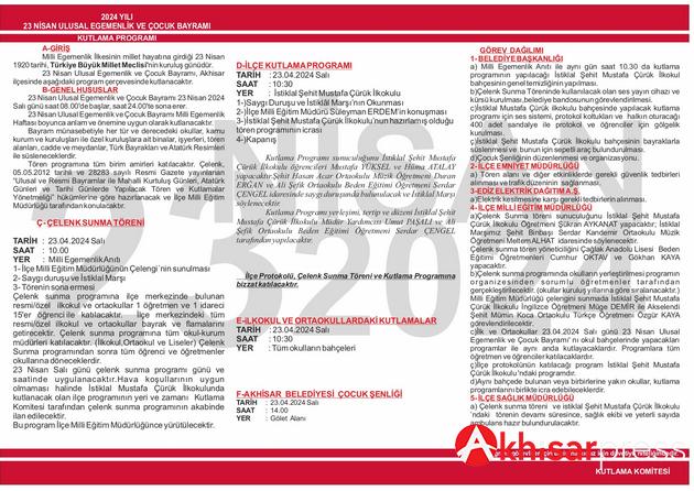 Akhisar’da, 23 Nisan Ulusal Egemenlik ve Çocuk Bayramı büyük bir coşkuyla kutlanacak. Bu özel gün, Türkiye Büyük Millet Meclisi'nin kuruluşunu ve milli egemenliğin ilanını temsil ediyor ve Akhisar’da geniş çaplı etkinliklerle anılacak. Program sabah 08.00'de başlayacak ve gece yarısına kadar devam edecek.