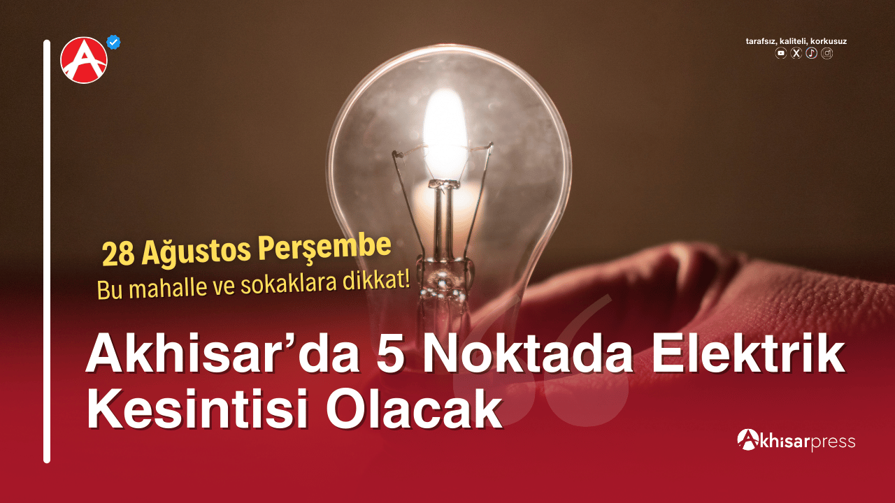 GDZ Elektrik tarafından yapılan açıklamaya göre, Manisa’nın Akhisar ilçesinde 28 Ağustos 2025 Çarşamba günü şebeke yenileme ve bakım çalışmaları kapsamında planlı elektrik kesintileri uygulanacak.