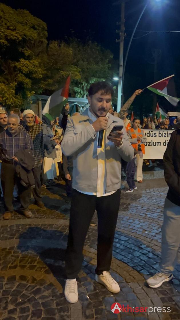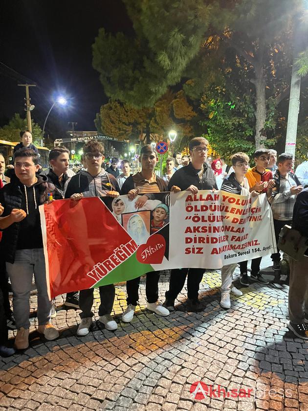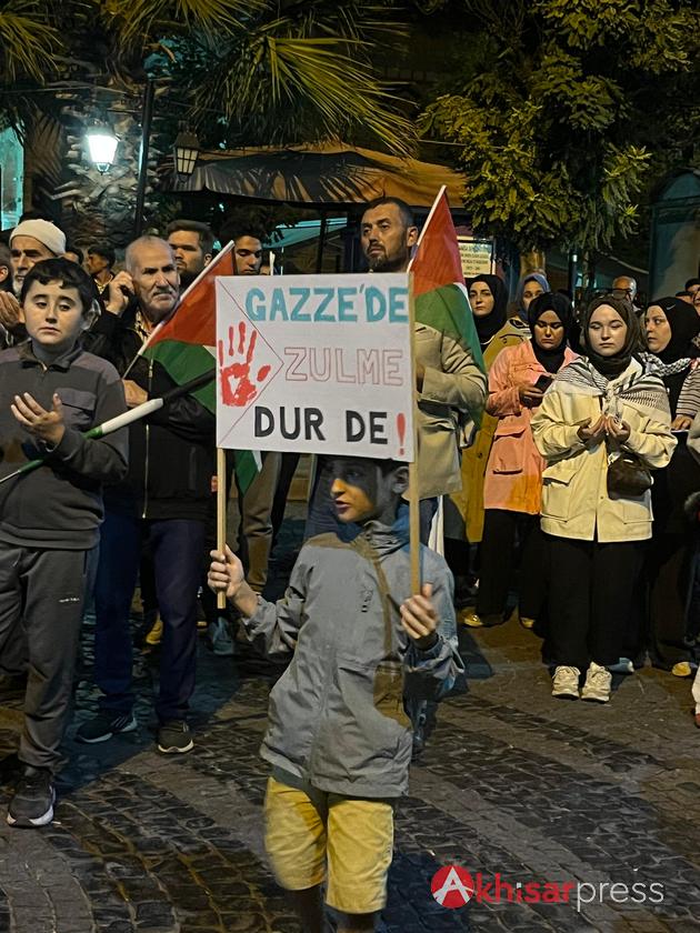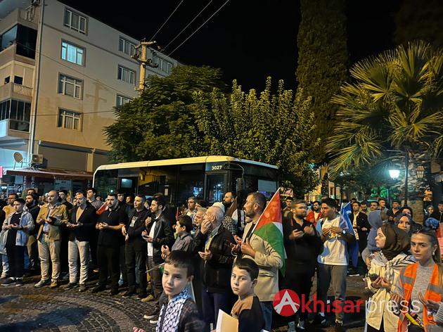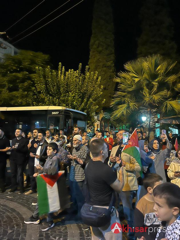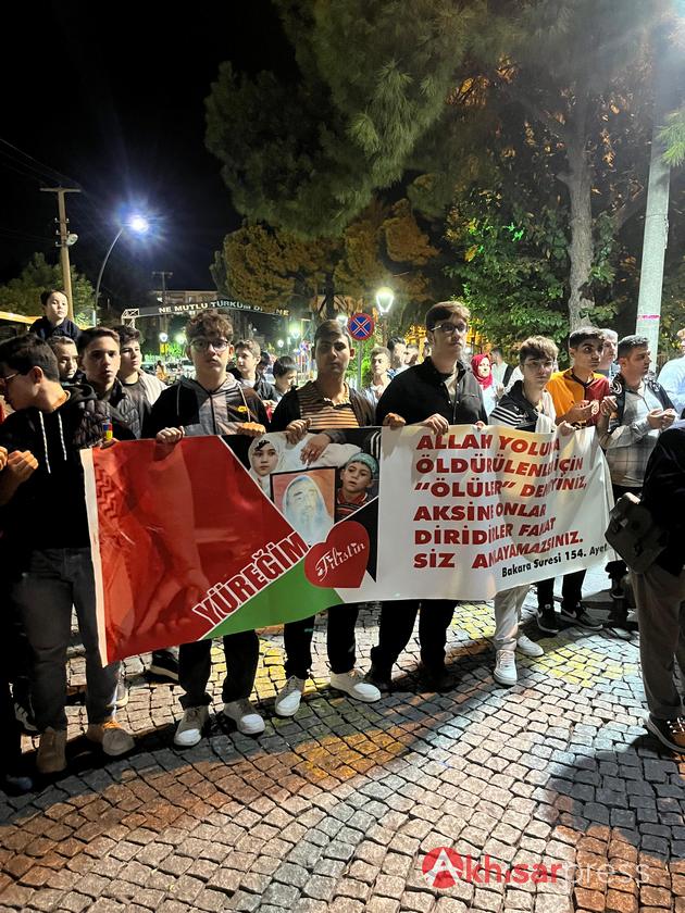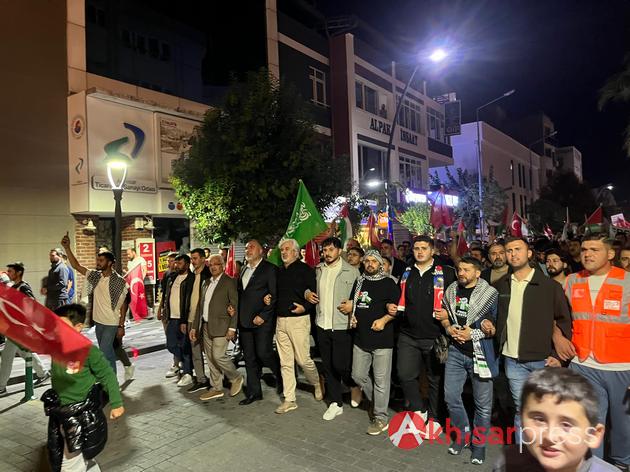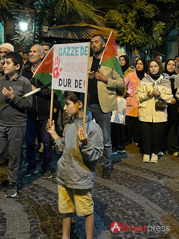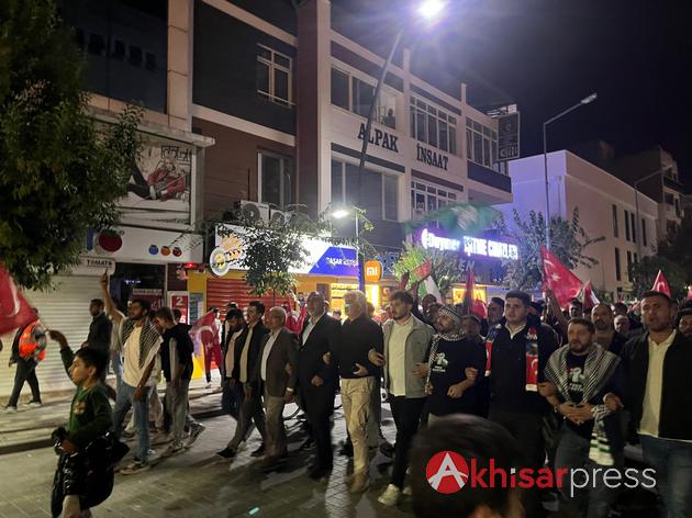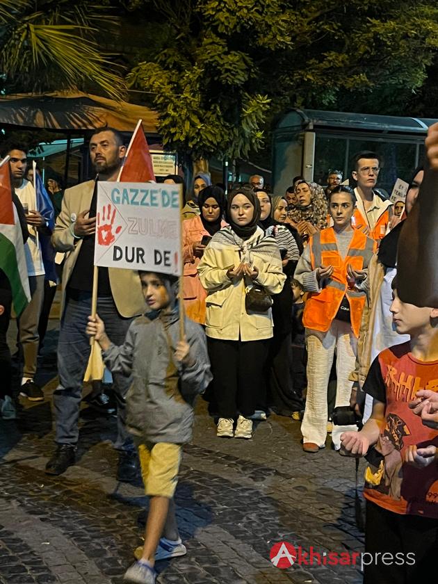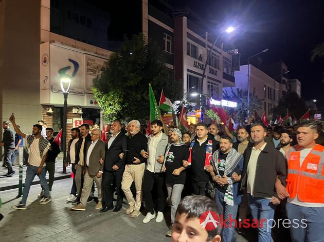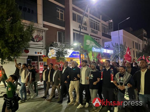 Akhisarlı vatandaşların yoğun katılım gösterdiği yürüyüşte, Filistin halkına güçlü bir destek mesajı verildi.