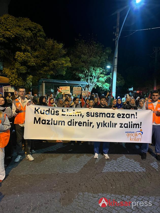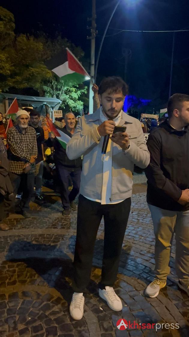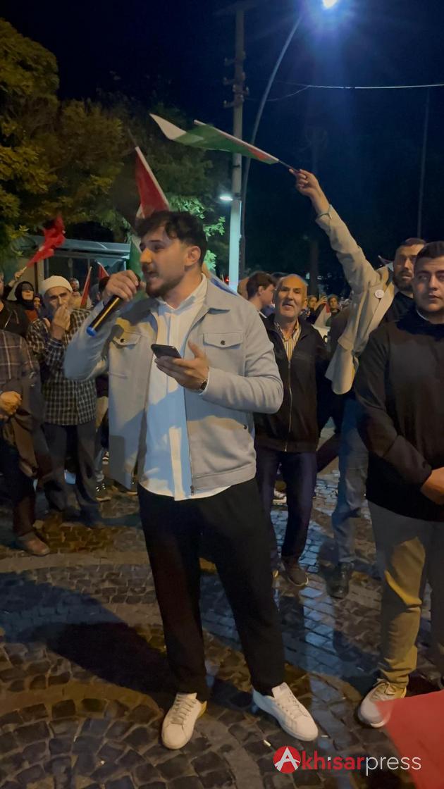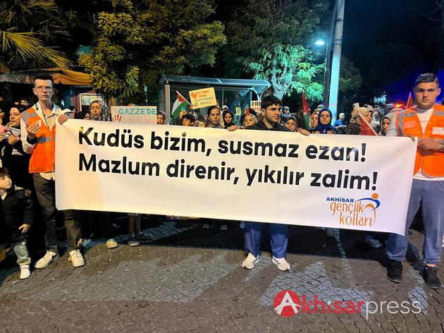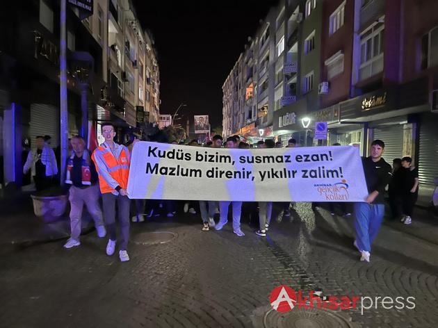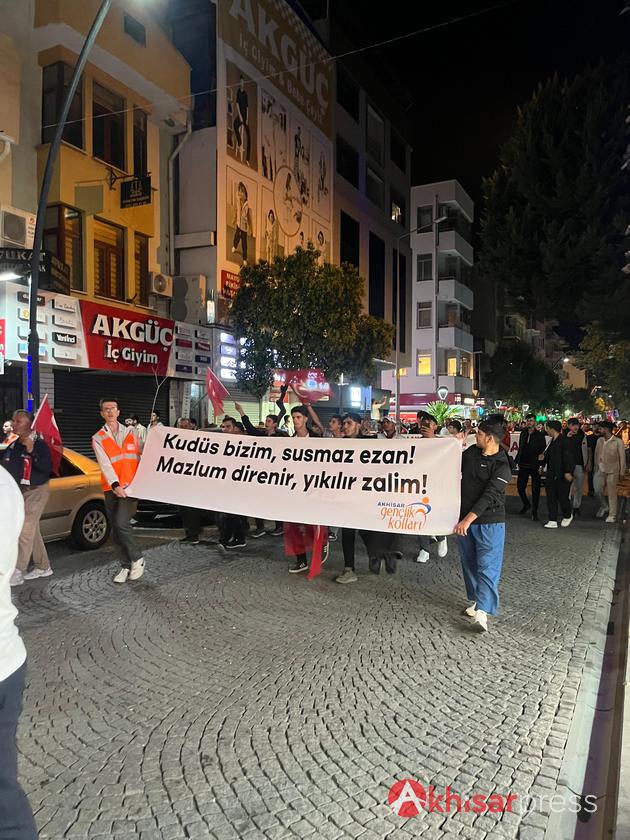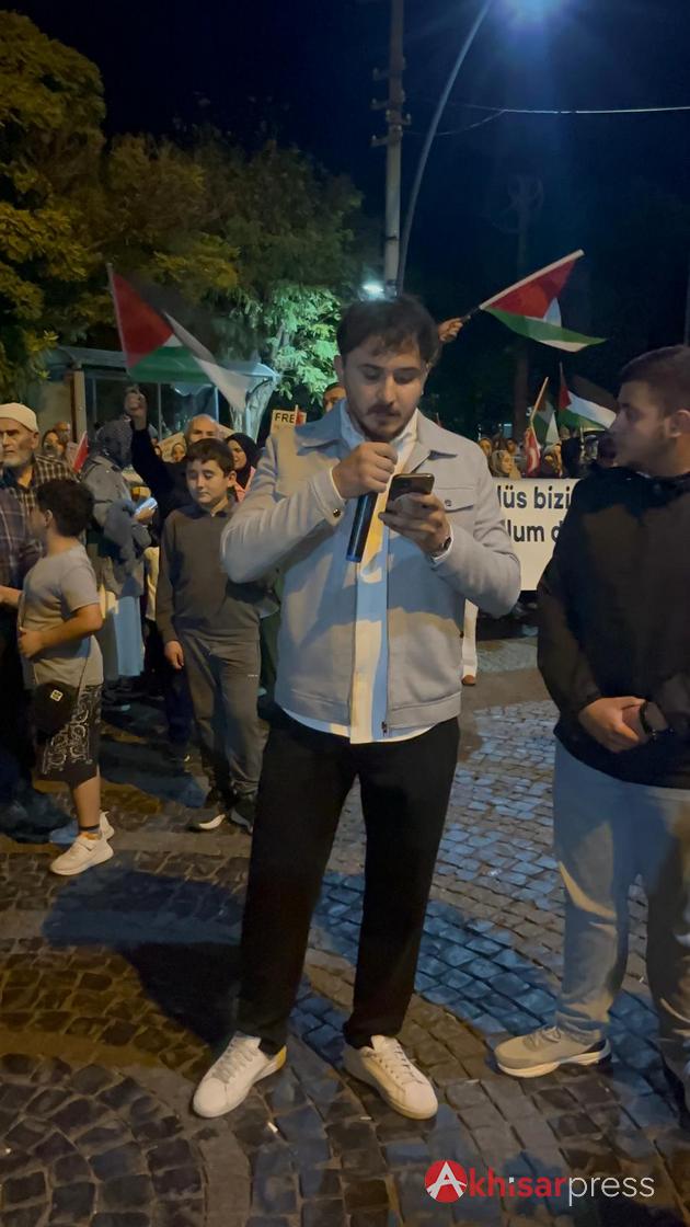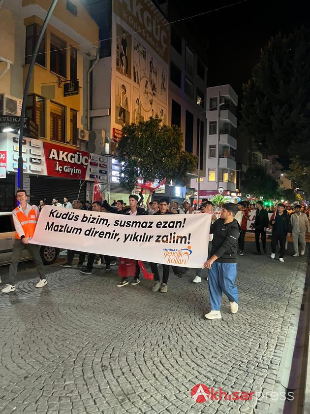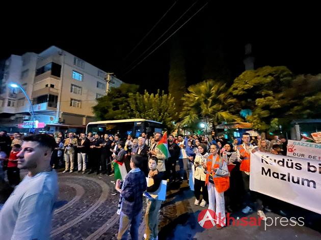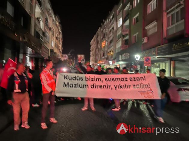 Akhisarlı vatandaşların yoğun katılım gösterdiği yürüyüşte, Filistin halkına güçlü bir destek mesajı verildi.