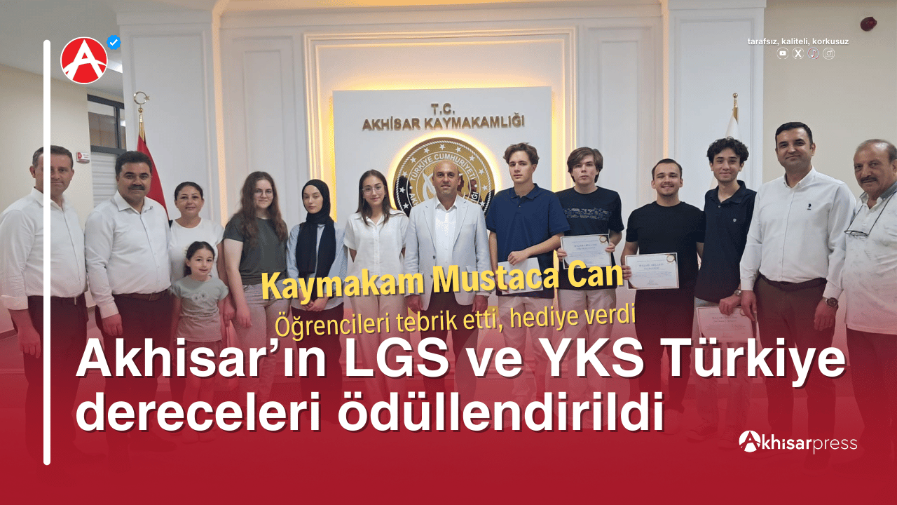 LGS’de 500 tam puanla Türkiye birincisi olan Ayvaz Dede İmam Hatip Ortaokulu öğrencisi Faruk Ferhat ile Akhisar Koleji Ortaokulu öğrencisi İslam Bera Çeneli; YKS’de TYT ve AYT puan türlerinde ilk 1000’e giren Macide Ramiz Taşkınlar Fen Lisesi öğrencileri Mert Ege Bambal, Rümeysa Nur Aydoğmuş, Meryem Mert, Eray Berk Köse, Talha Selmanoğlu, Enes Kasım Karaman, Rümeysa Akçakaya ve Akhisar Koleji Fen Lisesi öğrencisi Çağrı Erinkarlı, Kaymakamlık makamında düzenlenen törende ödüllerini aldı.