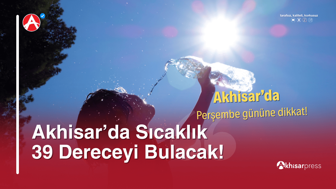 19-23 Ağustos tarihleri arasında Akhisar’da gündüz sıcaklıklarının 36-39 derece, gece sıcaklıklarının ise 23-25 derece arasında olacağı öngörülüyor. Uzmanlar, özellikle perşembe ve cuma günleri dışarı çıkacak vatandaşları güneş çarpması ve sıcak havaya bağlı sağlık sorunlarına karşı dikkatli olmaları konusunda uyardı.