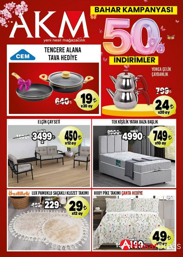 Akhisar'daki 2. Nakliye Caddesi'nde faaliyet gösteren AKM Alışveriş Merkezi, "Bahar Kampanyası" ile müşterilerine yüzde 50 indirim fırsatı sunuyor. Beyaz eşyadan züccaciyeye, ev tekstilinden küçük ev aletlerine, çeyiz paketlerinden birçok üründe geçerli olan bu indirimlerle alışveriş keyfini kaçırmayın.