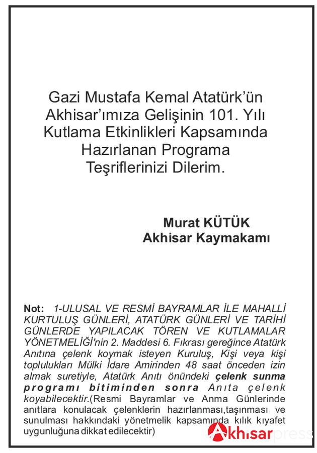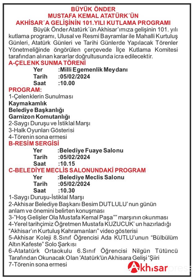 Mustafa Kemal Atatürk’ün Akhisar’a gelişinin 101. Yılı kutlama programı açıklandı.
