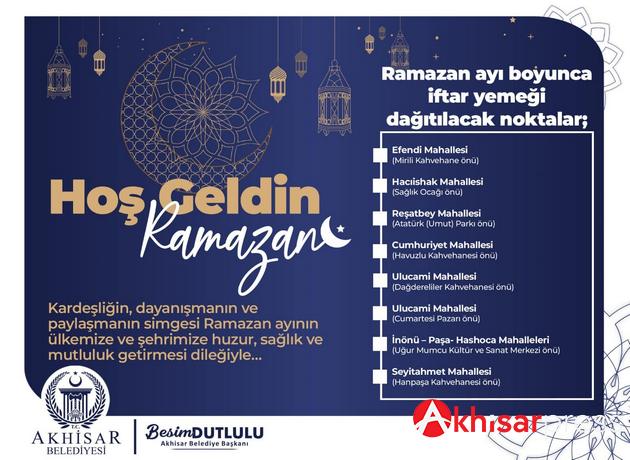 Akhisar Belediye Başkanı Besim Dutlulu, Ramazan ayı dolayısıyla geleneksel hale gelen iftar yemeği dağıtım noktalarını açıkladı. Başkan Dutlulu, her yıl olduğu gibi bu yıl da ihtiyaç sahiplerinin yanında olmaya devam edeceklerini belirterek tüm Akhisar halkının Ramazan ayını tebrik etti.