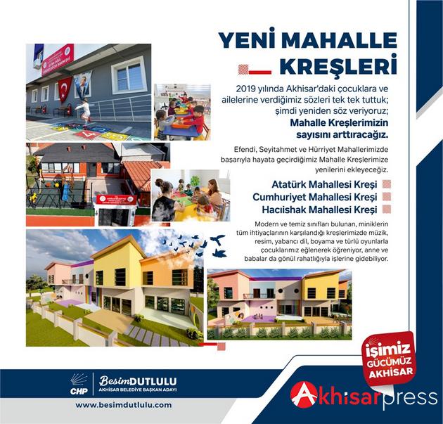 31 Mart 2019 yerel seçimlerinde Akhisar halkının destekleri ile Akhisar Belediye Başkanı seçilen ve görevini başarıyla sürdüren Başkan Besim Dutlulu, hizmet ve yatırım dolu 5 yılı geride bıraktı. Akhisar için 5 yıl daha hizmet etmek istediğini söyleyen Dutlulu, Seyitahmet, Efendi ve Hürriyet Mahallesi Kreşlerine ek olarak yeni dönemde 3 tane daha mahalle kreşi açacaklarını duyurdu.