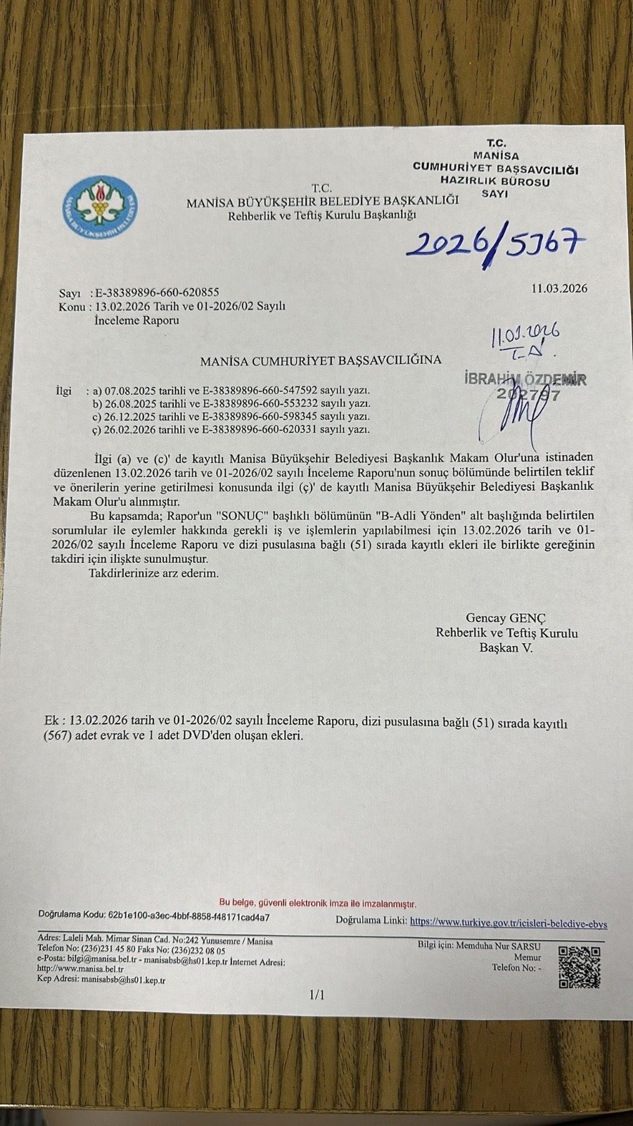 Söz konusu iddiaların ardından Başkan Dutlulu, haberin altına resmi belge paylaşarak yanıt verdi. Paylaşılan belgede, Manisa Büyükşehir Belediyesi Rehberlik ve Teftiş Kurulu Başkanlığı tarafından hazırlanan 13 Şubat 2026 tarihli inceleme raporunun, 11 Mart 2026 tarihinde Manisa Cumhuriyet Başsavcılığı’na gönderildiği belirtildi.
