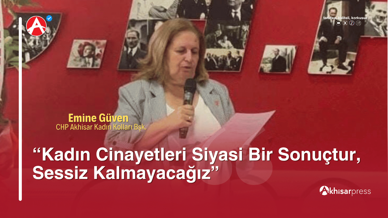 Cumhuriyet Halk Partisi (CHP) Akhisar İlçe Kadın Kolları Başkanı Emine Güven, son dönemde artan kadın cinayetlerine ilişkin yazılı bir basın açıklaması yaparak, yaşanan vahşetin bireysel değil, toplumsal ve siyasi bir sorun olduğuna dikkat çekti.
