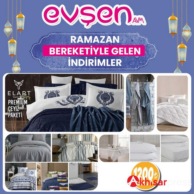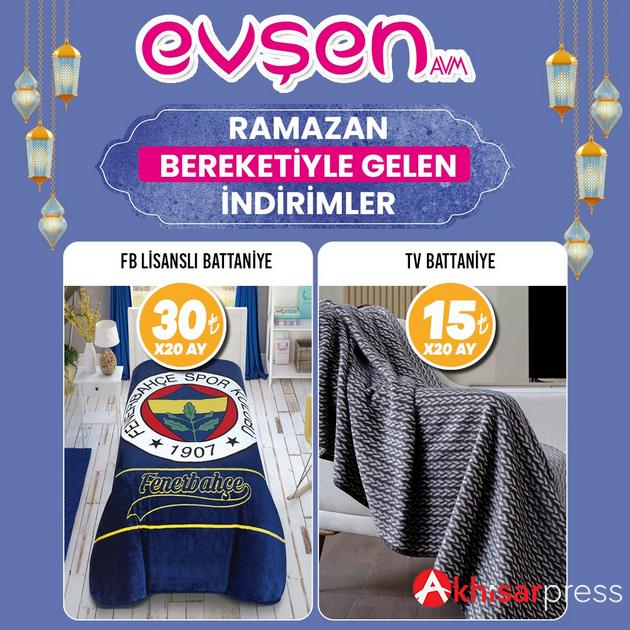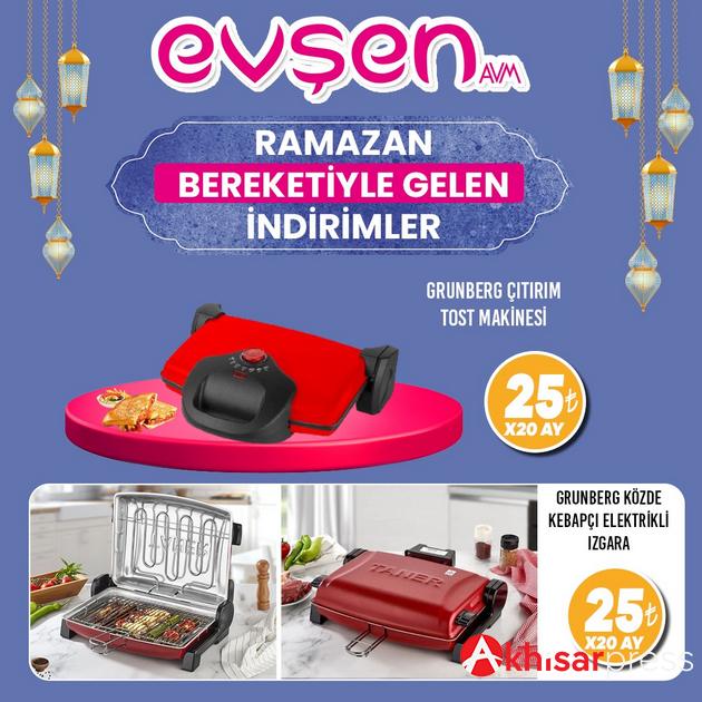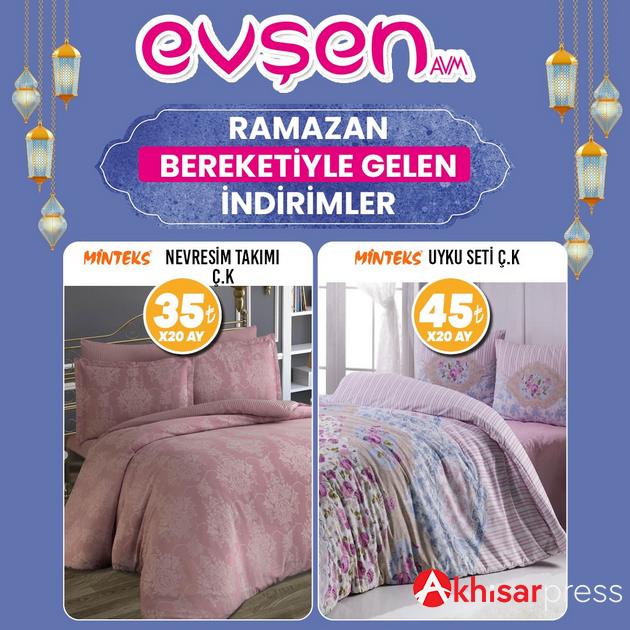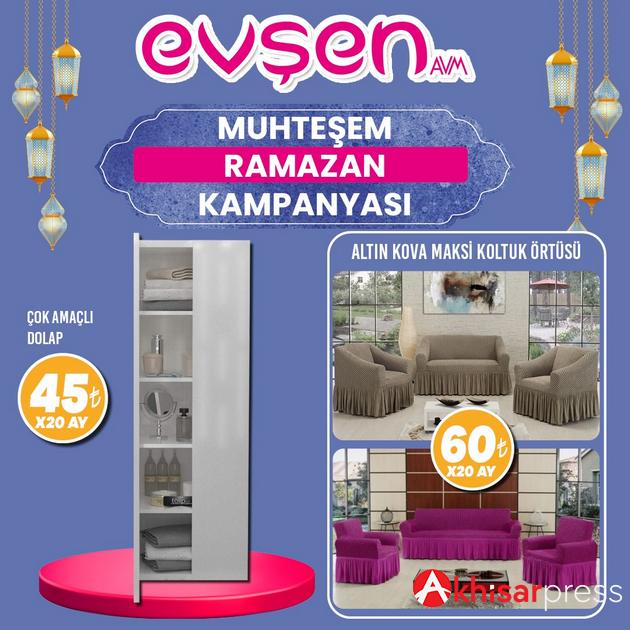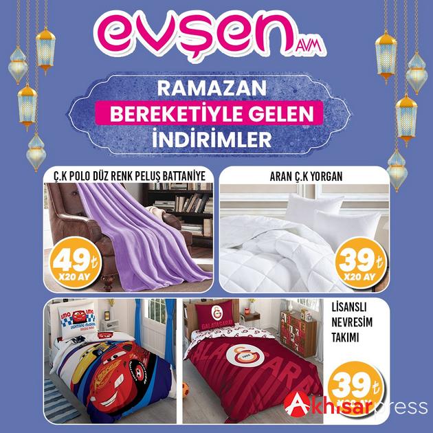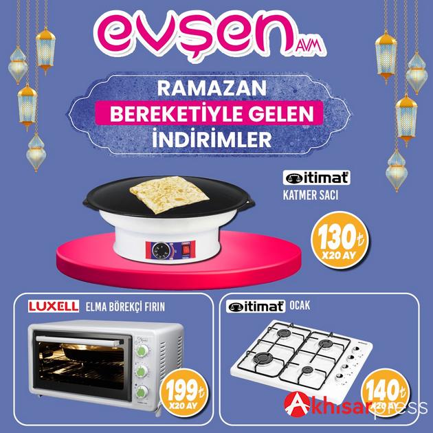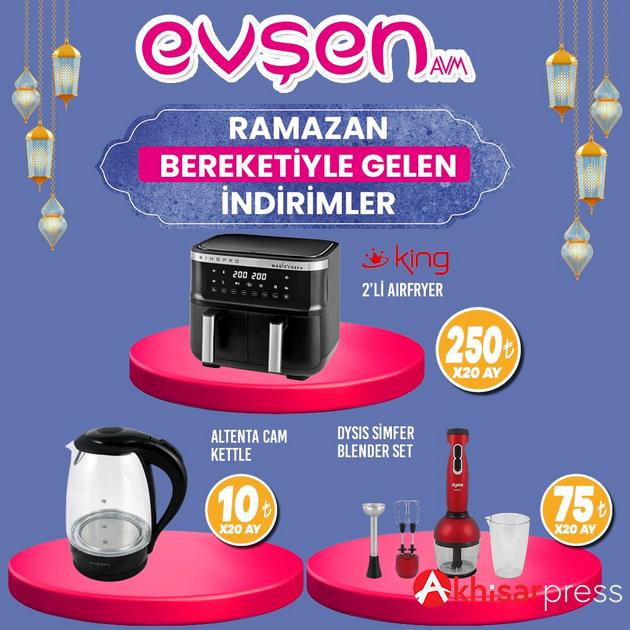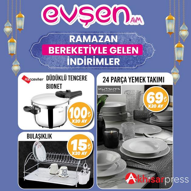 Akhisar'ın 1. Nakliye Caddesi üzerinde bulunan Evşen AVM, Ramazan Bereketiyle Gelen İndirimler kampanyasını başlattı. Alışveriş merkezi, birbirinden çeşitli kategorilerdeki ürünlerde cazip indirimlerle müşterilere avantajlı alışveriş imkanı sunuyor. Kampanya kapsamında tekstil ürünlerinden züccaciyeye, ev aletlerinden elektronik ürünlere, mobilyadan beyaz eşyaya kadar geniş bir ürün yelpazesinde indirimler uygulanacak.