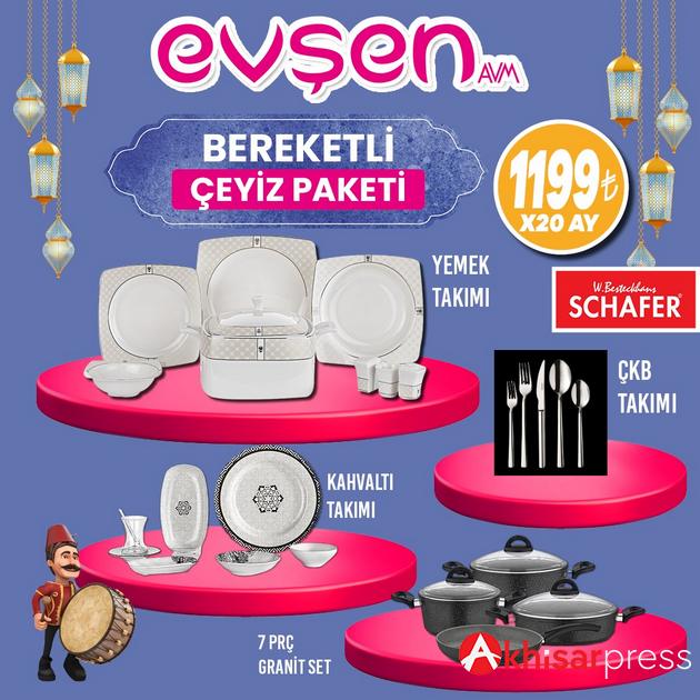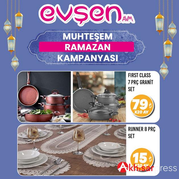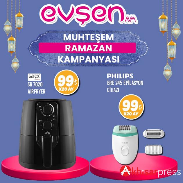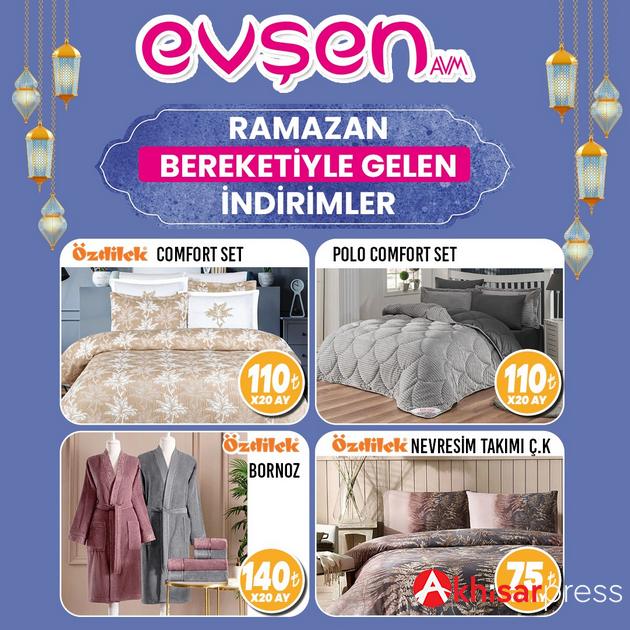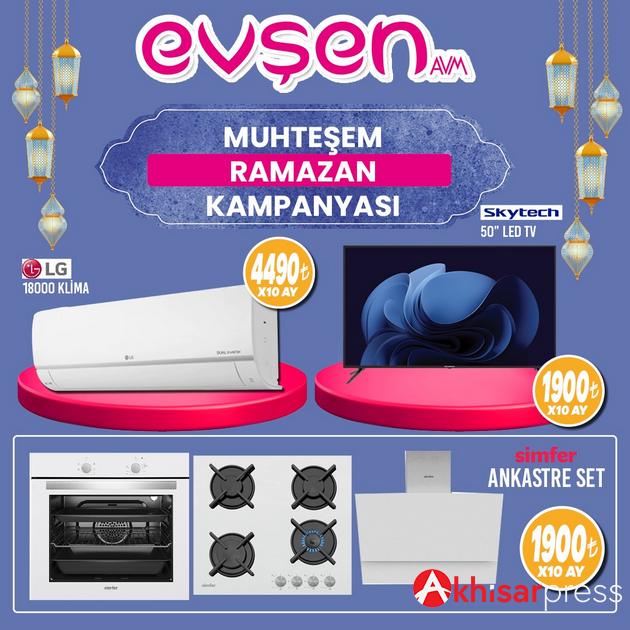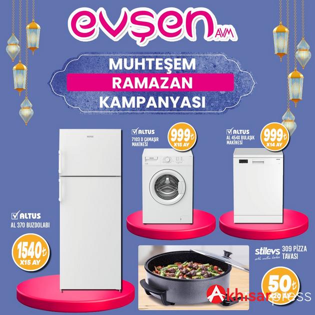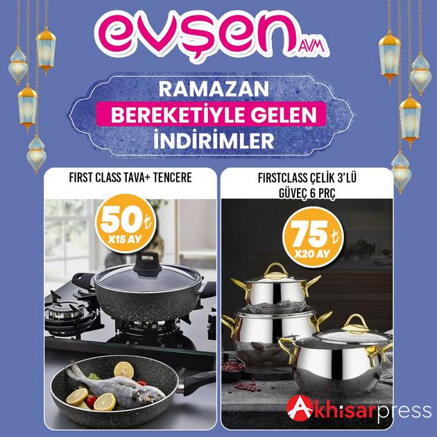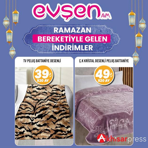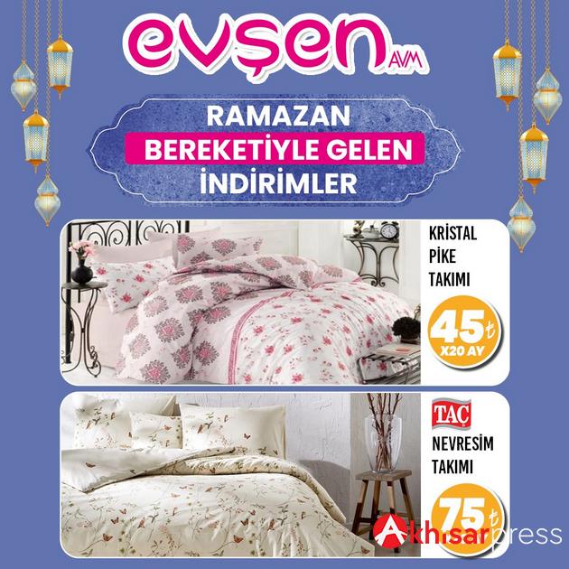 Akhisar'ın 1. Nakliye Caddesi üzerinde bulunan Evşen AVM, Ramazan Bereketiyle Gelen İndirimler kampanyasını başlattı. Alışveriş merkezi, birbirinden çeşitli kategorilerdeki ürünlerde cazip indirimlerle müşterilere avantajlı alışveriş imkanı sunuyor. Kampanya kapsamında tekstil ürünlerinden züccaciyeye, ev aletlerinden elektronik ürünlere, mobilyadan beyaz eşyaya kadar geniş bir ürün yelpazesinde indirimler uygulanacak.