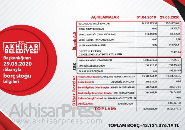 Akhisar Belediyesi, ‘Şeffaf Belediyecilik’ anlayışıyla göreve başladıkları günden bu yana belediyenin borç durumu ve mali yapısını kalem kalem vatandaşlara açıkladı. Açıklamada, Akhisar halkının parasını Akhisarlılar için kullanırken verdikleri şeffaf belediyecilik sözlerini tutan Akhisar Belediyesi, vatandaşlara karşı olan sorumlulukları gereği bu açıklamayı yaptıkları belirtildi.