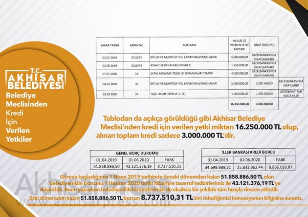 Tablodan da açıkça görüldüğü gibi Akhisar Belediye Meclisi’nden kredi için verilen yetki miktarı 16.250.000 TL olup, alınan toplam kredi sadece 3.000.000 TL’dir.