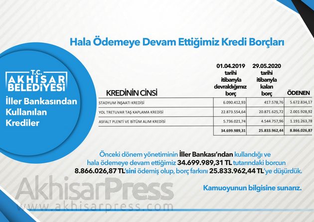 2 Mayıs 2019 tarihinde Akhisar’ımızdaki bozuk yolları onarmak adına bitüm ve muhtelif yol bakım malzemesi alımı için istediğimiz ve Akhisar Belediyesi Mayıs Ayı Meclis Toplantısı’nda onaylanarak yetkisi verilen 5.000.000 TL tutarındaki kredi İller Bankası’nca onaylanmadığı için alınamamıştır.