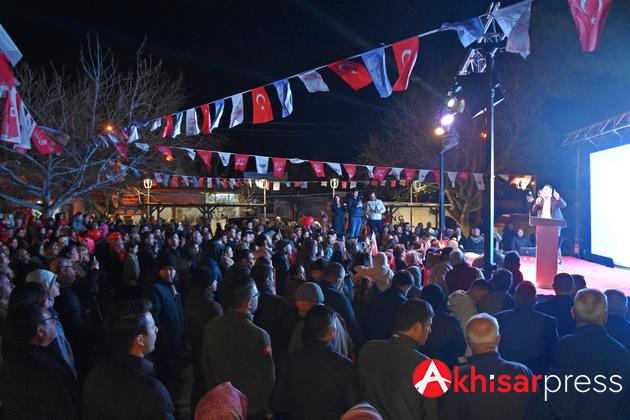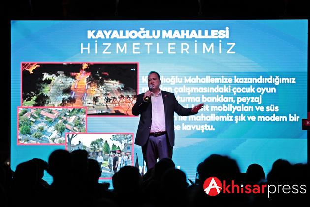Kayalıoğlu halkına seslenen Akhisar Belediye Başkanı Besim Dutlulu, yaptığı konuşmasında 5 yılda Akhisar’da ve Kayalıoğlu Mahallesi’nde gerçekleştirdiği hizmetlerden bahsetti. Yeni meydan çalışması, sıcak ve soğuk asfalt çalışmaları, sosyal tesis, aile çay bahçesi, parke taş çalışmaları, arazi yolu çalışmaları, sosyal ve kültürel çalışmalar gibi birçok alanda çok güzel hizmetler yaptıklarını söyleyen Başkan Dutlulu, “Yıllardır hizmetten mahrum kalan Kayalıoğlu Mahallesi, hak ettiği hizmetlere bizim dönemimizde kavuştu. Ama yetmez; ikinci dönemimizde hem Akhisar merkezinde hem de kırsalda daha çok çalışacağız. Halkımızın destekleri bizimle olduğu sürece bu şehre daha çok hizmet edeceğiz. Bu akşam bizleri coşkuyla karşılayan Kayalıoğlu halkımızın 31 Mart seçimlerinde sandıkları patlatacağına ve hizmete, çalışkanlığa oy vereceklerine yürekten inanıyorum. Misafirperverlikleri ve gösterdikleri ilgi için Kayalıoğlu halkımıza çok teşekkür ediyorum” dedi.
