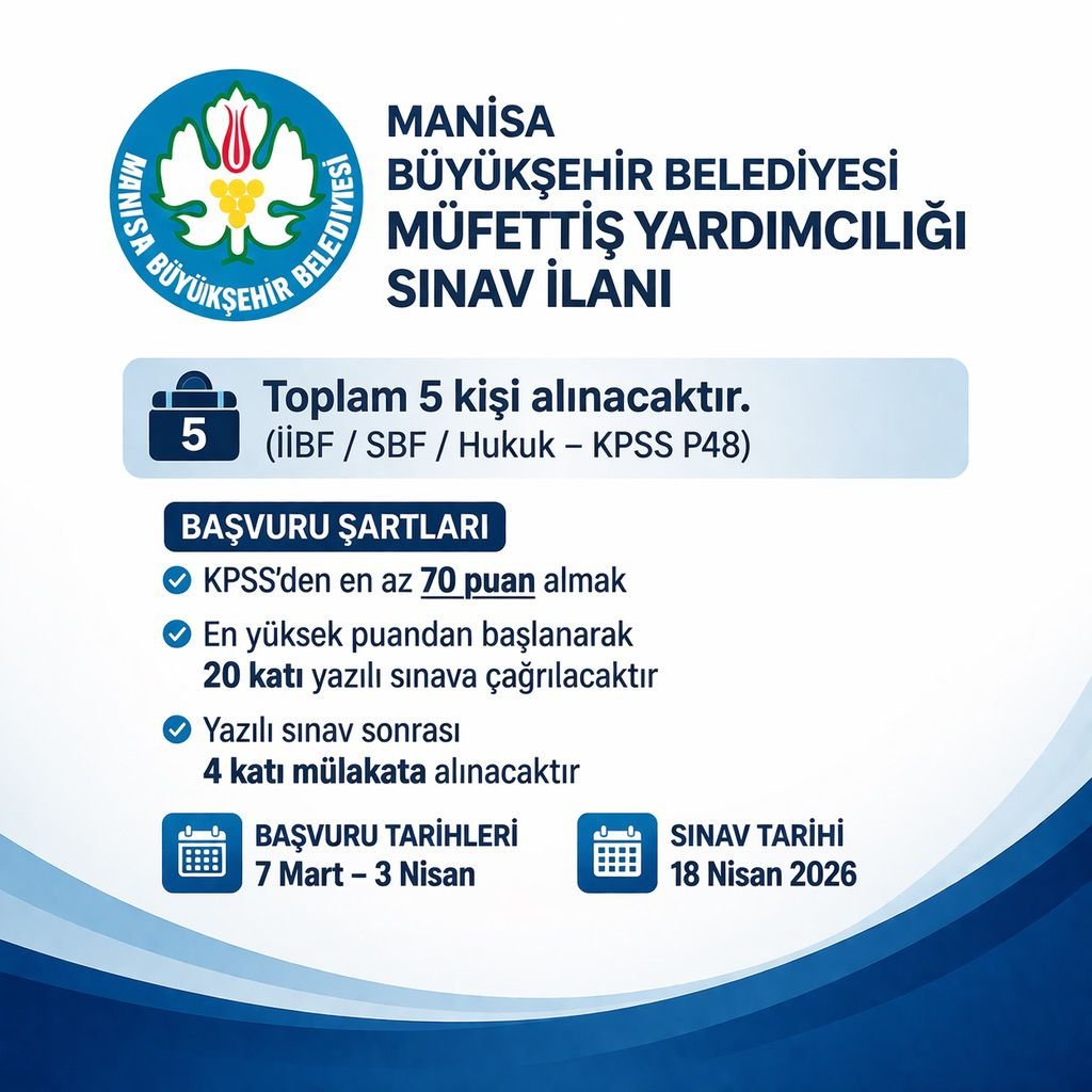 Manisa Büyükşehir Belediyesi, müfettiş yardımcılığı kadrosu için personel alımı yapacağını duyurdu. Yapılan açıklamaya göre, toplam 5 kişi istihdam edilecek.