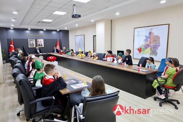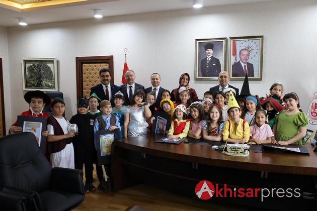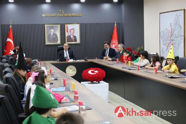 Akhisar’da Misak-ı Milli İlkokulu 3. sınıf öğrencileri ve öğretmenleri, Kaymakam Mustafa Can’ı makamında ziyaret etti.