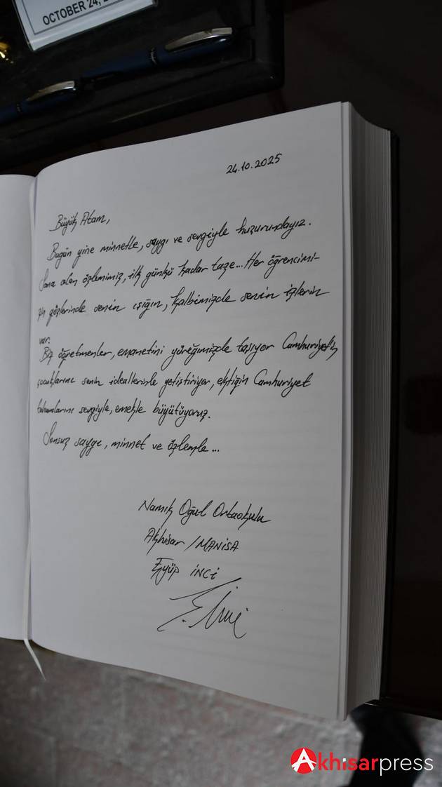 “Büyük Atam, Bugün yine minnetle, sevgiyle huzurundayız. Sana olan özlemimiz, ilk günkü kadar taze… Biz öğretmenler, emanetini yüreğimizde taşıyor; Cumhuriyet’in çocuklarını senin ideallerinle yetiştiriyor, ektiğin Cumhuriyet tohumlarını sevgiyle, emekle büyütüyoruz. Sonsuz saygı, minnet ve özlemle…”