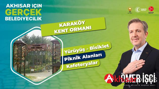 Başkan adayı, Akhisarlıların sevdiği piknik alanlarından biri olan Karaköy Çamlığının "Karaköy Kent Ormanı Projesi" kapsamında Akhisarlılara kazandırılacağını belirtti.