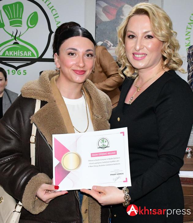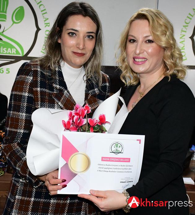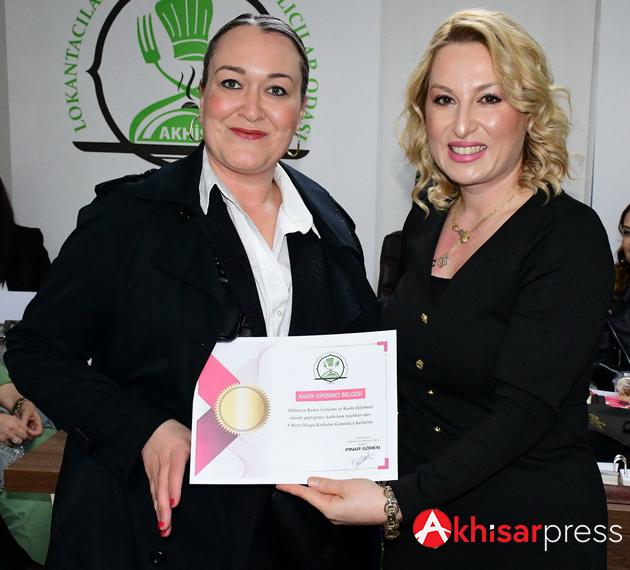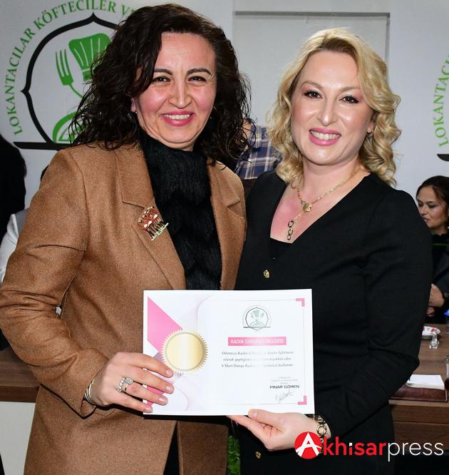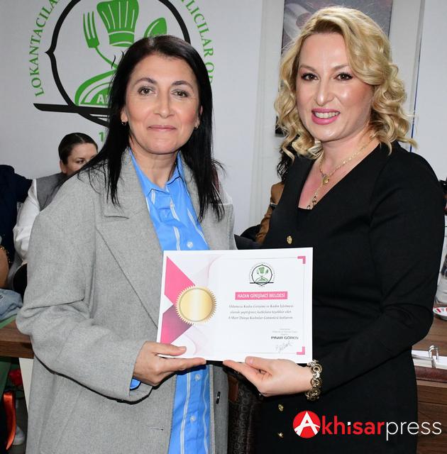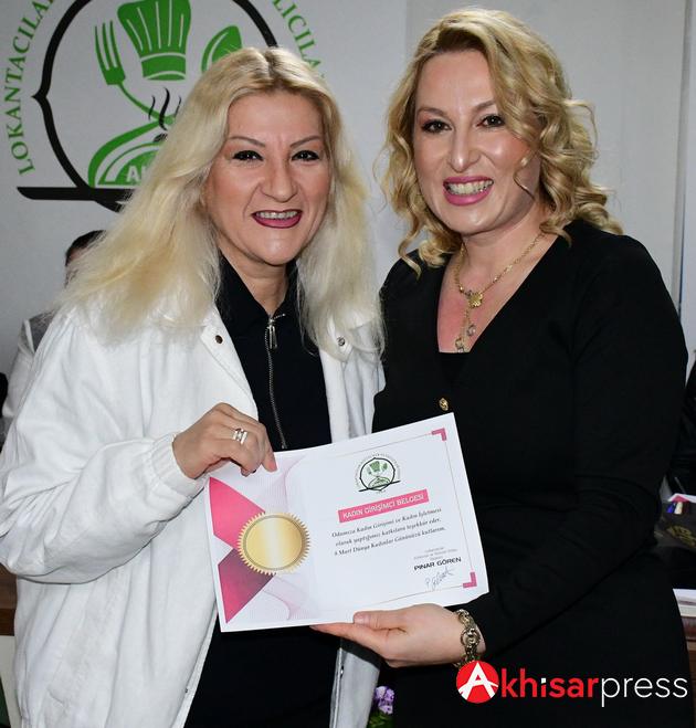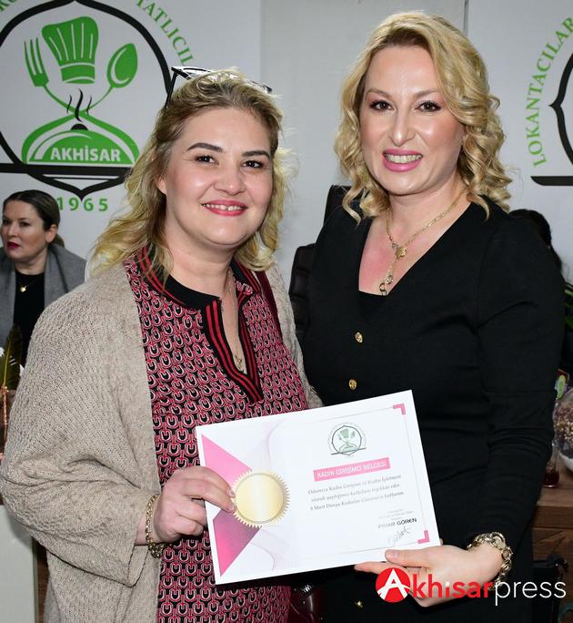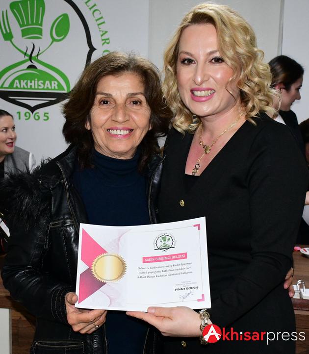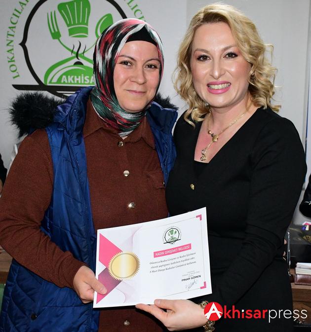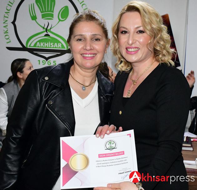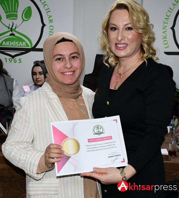 Akhisar Lokantacılar, Köfteciler, Tatlıcılar Odası Başkanı ve TESK (Türkiye Esnaf ve Sanatkârlar Konfederasyonu) Kadın Esnaf Kurulu Üyesi Pınar Gören, 8 Mart Dünya Kadınlar gününde Oda Lokalinde yaklaşık 150 kadın esnafa girişimcilik belgesi ve hediyeler takdim ederek kadınlar gününü kutladı.